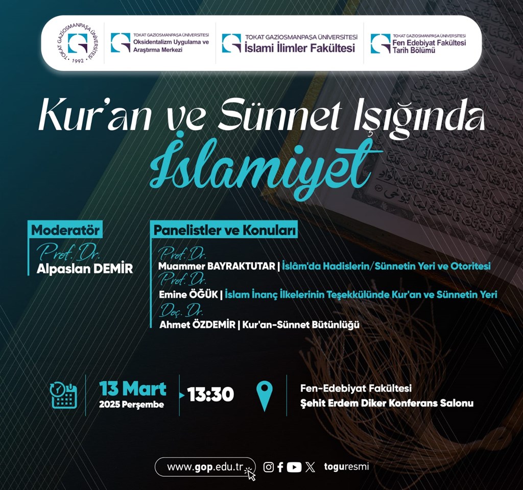 Fakültemiz Şehir Erdem Diker konferans salonunda 13. 03. 2025 perşembe günü bölüm başkanımız Prof. Dr. Alpaslan DEMİR'in moderatörlüğünde "Kur'an ve Sünnet Işığında İslamiyet" konulu bir panel gerçekleştirilecektir.